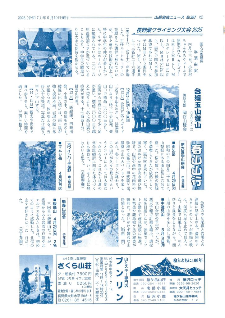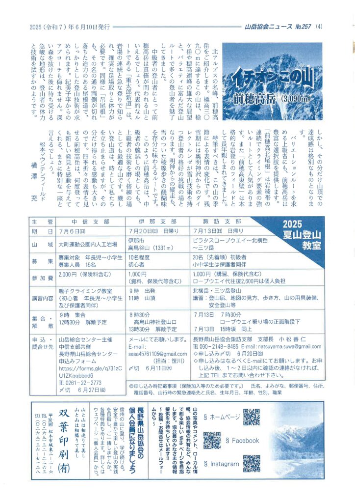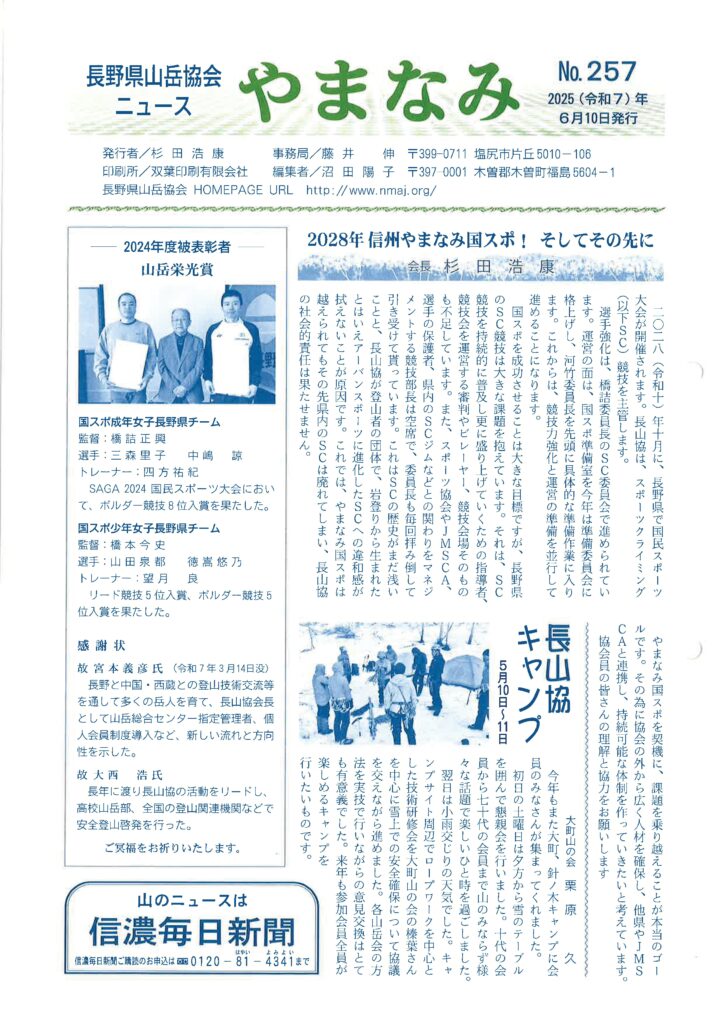 HOMEお知らせ 長野県山岳協会ニュース「やまなみ」を発刊しました。257号(2025年6月)です。是非ご覧ください。PDF版はこちらから。 2005(平成14)年 ネパール山岳協会と友好協定締結 協会誌「やまなみ」258号