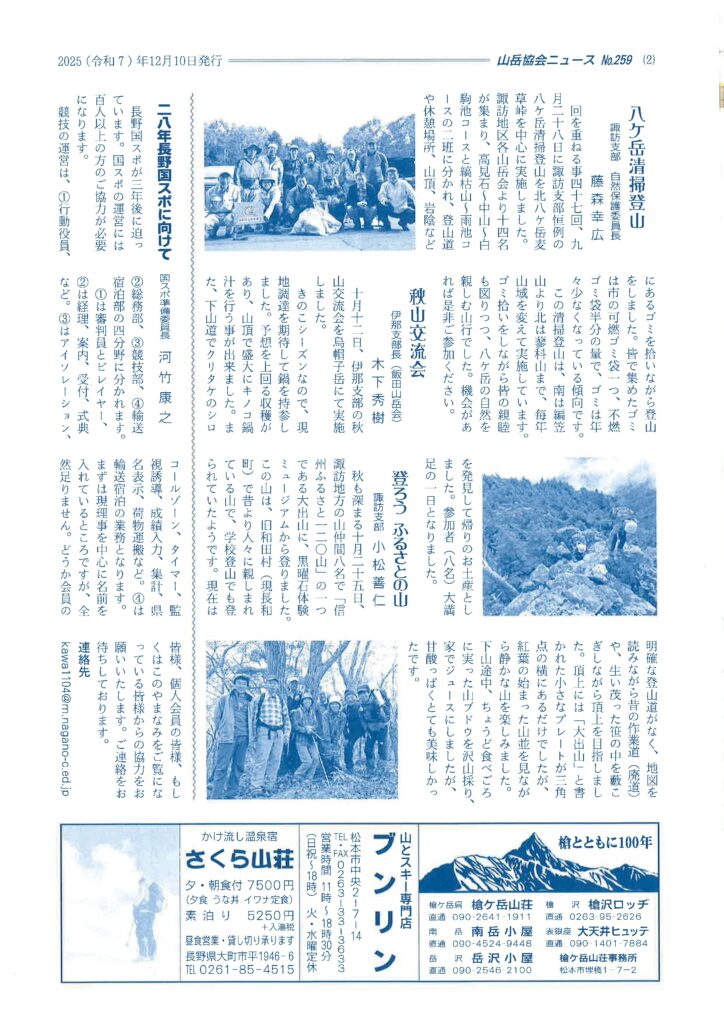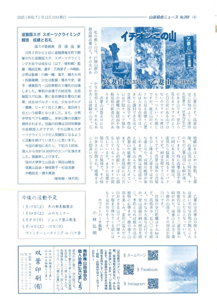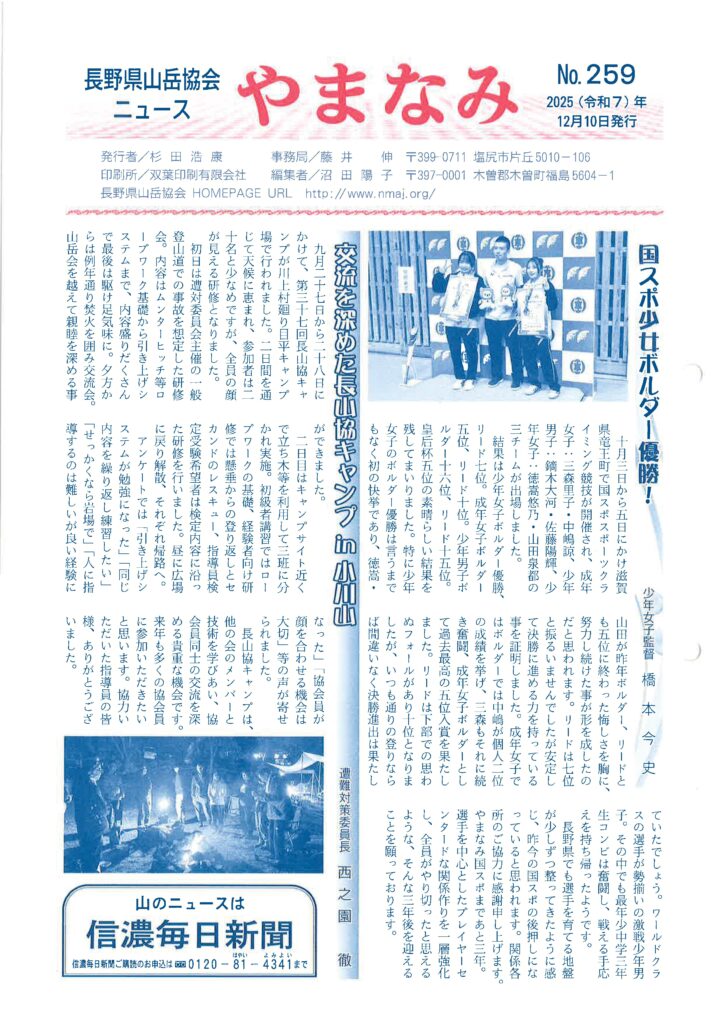 HOMEお知らせ 長野県山岳協会ニュース「やまなみ」を発刊しました。259号(2025年12月)です。是非ご覧ください。PDF版はこちらから。 協会誌「やまなみ」258号 「長野県クライミング大会2026」4/12(日)