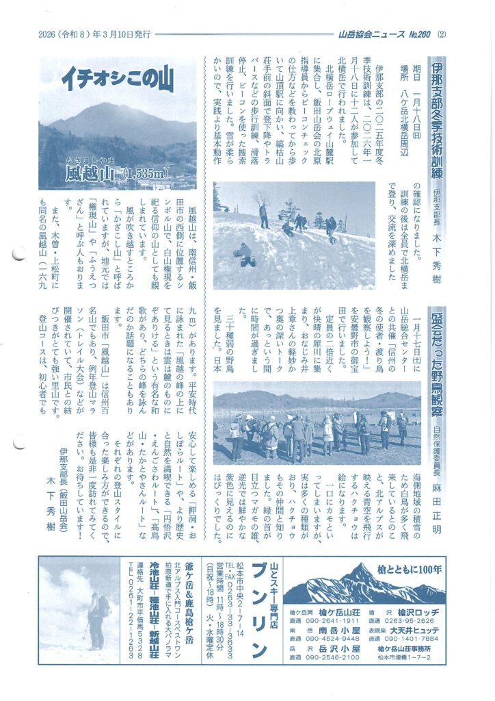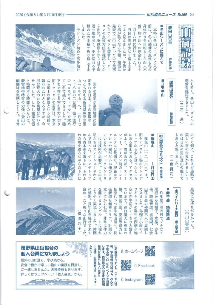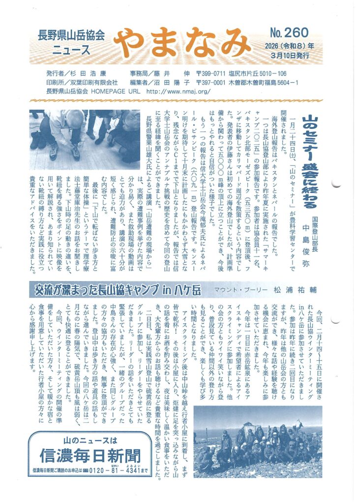 HOMEお知らせ 長野県山岳協会ニュース「やまなみ」を発刊しました。260号(2026年3月)です。是非ご覧ください。PDF版はこちらから。 「長野県クライミング大会2026」4/12(日) 第67回長野県山岳協会・総会